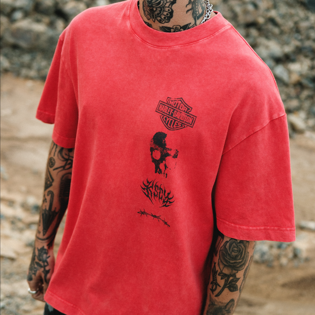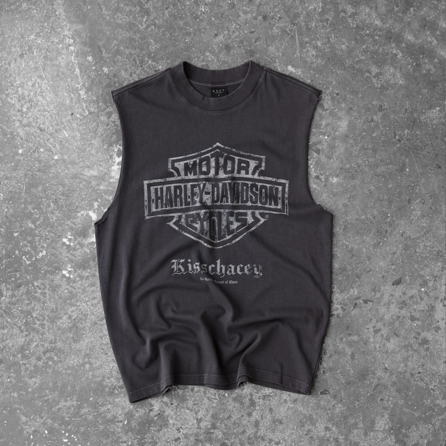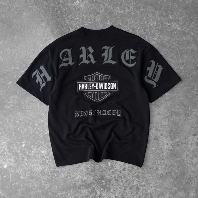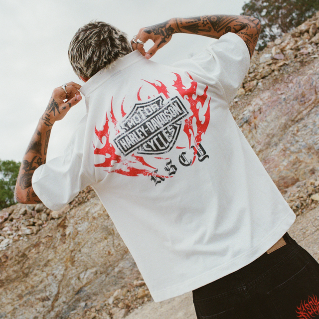 Every wash, fade, and distress level was intentionally developed to feel authentic to both brands. We rebuilt these details from the ground up to honour the heritage of Harley tees while bringing in the bold design direction that has defined KSCY. This collection aims to be both familiar and new — a balance of Harley-Davidson archive and KSCY’s distinct brand of chaos. Designed to look lived-in from day one, built with intention, and shaped by an appreciation for where both brands have come from.